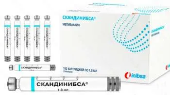 Препарат Скандинибса 3% (международное непатентованное название - мепивакаин) выпускается в виде раствора для инъекций (30 мг/мл) в карпулах объемом 1,8 мл. Карпулы изготовлены из бесцветного боросиликатного стекла тип 1 ЕФ. На карпуле с мепивакаином размещена этикетка, один конец герметично укупорен серым плунжером из эластомера, а другой конец закрыт диск из эластомера, обкатанный алюминиевым колпачком.